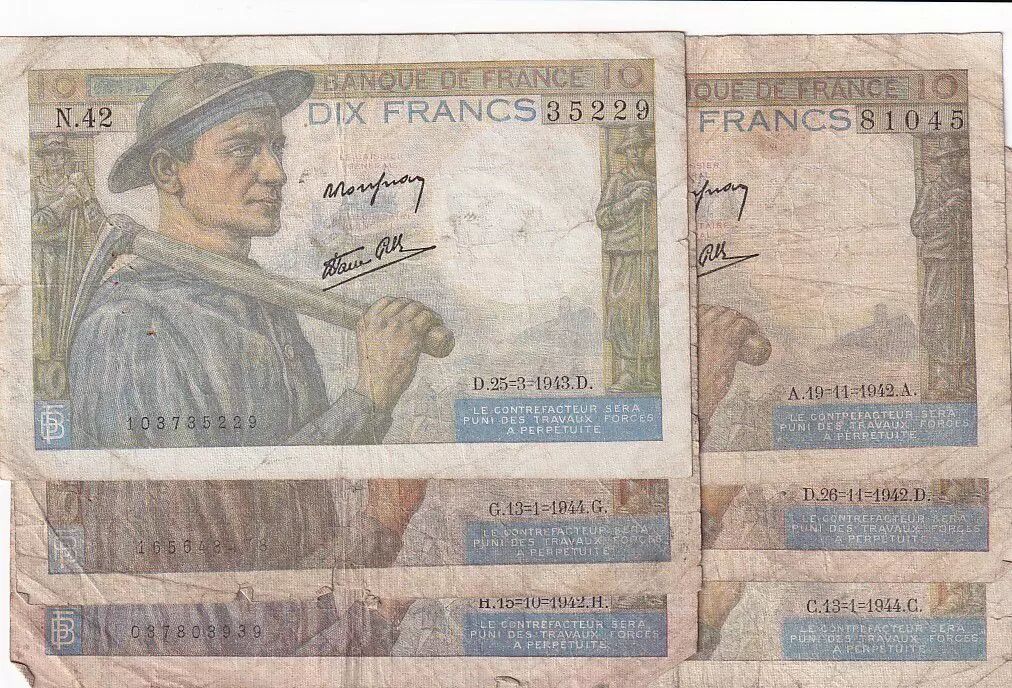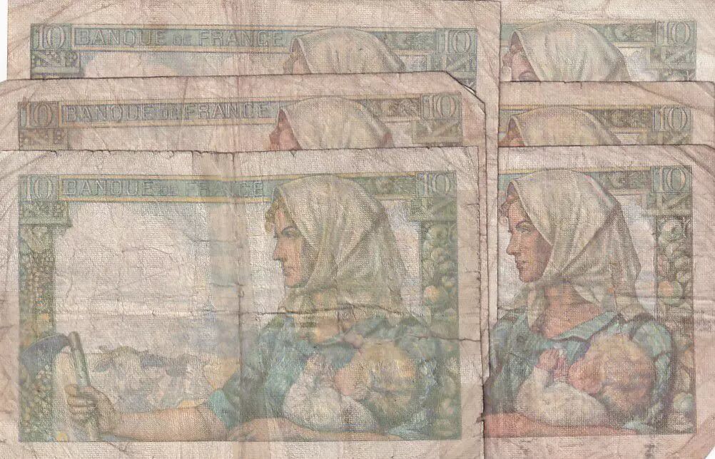 Lot 6 billets différents - Etat B à TB. Plis, salissures, coupures, tâches, petits manques