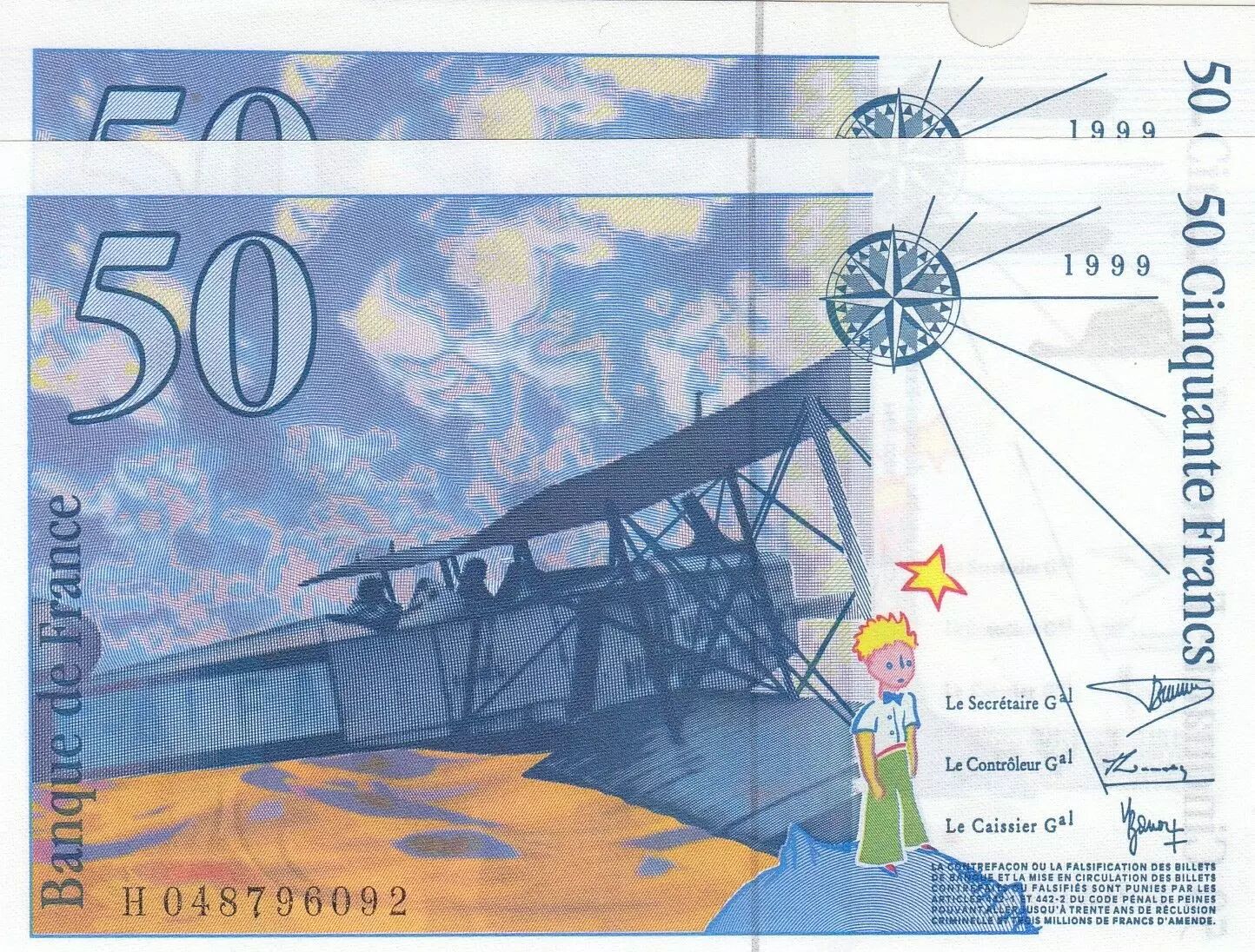 Lot de 2 Billets - 50 Francs - Saint-Exupéry - 1999 - Série H.048 - Numéros Consécutifs dont un billet annulé
