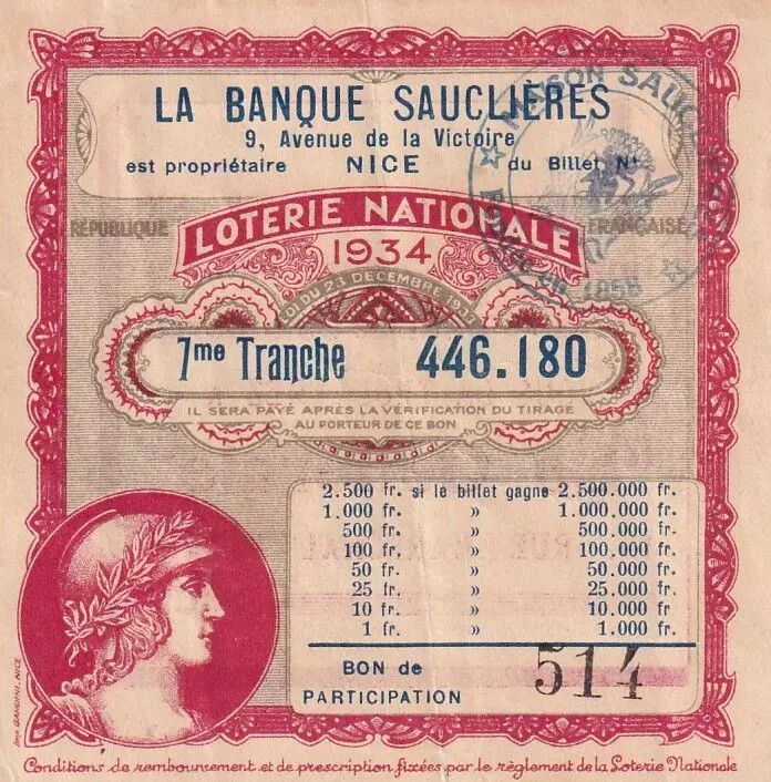 Billet France Loterie nationale - La banque Sauclières - 1934