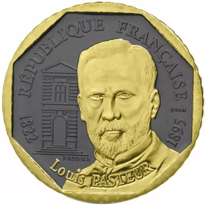 The legendary "2 Francs Pasteur" coin in a limited edition of 200 worldwide. Nickel coin with application of ruthenium and gold by a private institute.