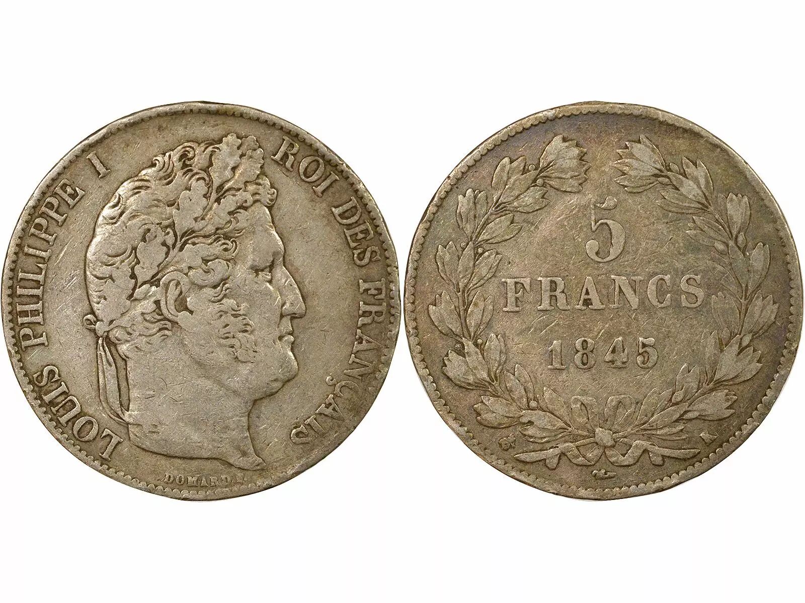 The 5-franc silver coin minted in 1845 during the reign of Louis-Philippe I is a remarkable example of Monarchy of July coinage, struck at the Bordeaux mint. Weighing 25 grams and measuring 37 mm in diameter, this coin represents the stability and prestige of 19th-century French monarchy. The version features a high-relief type, giving it a particularly elegant and detailed appearance, a feature highly sought after by numismatists for its engraving quality.