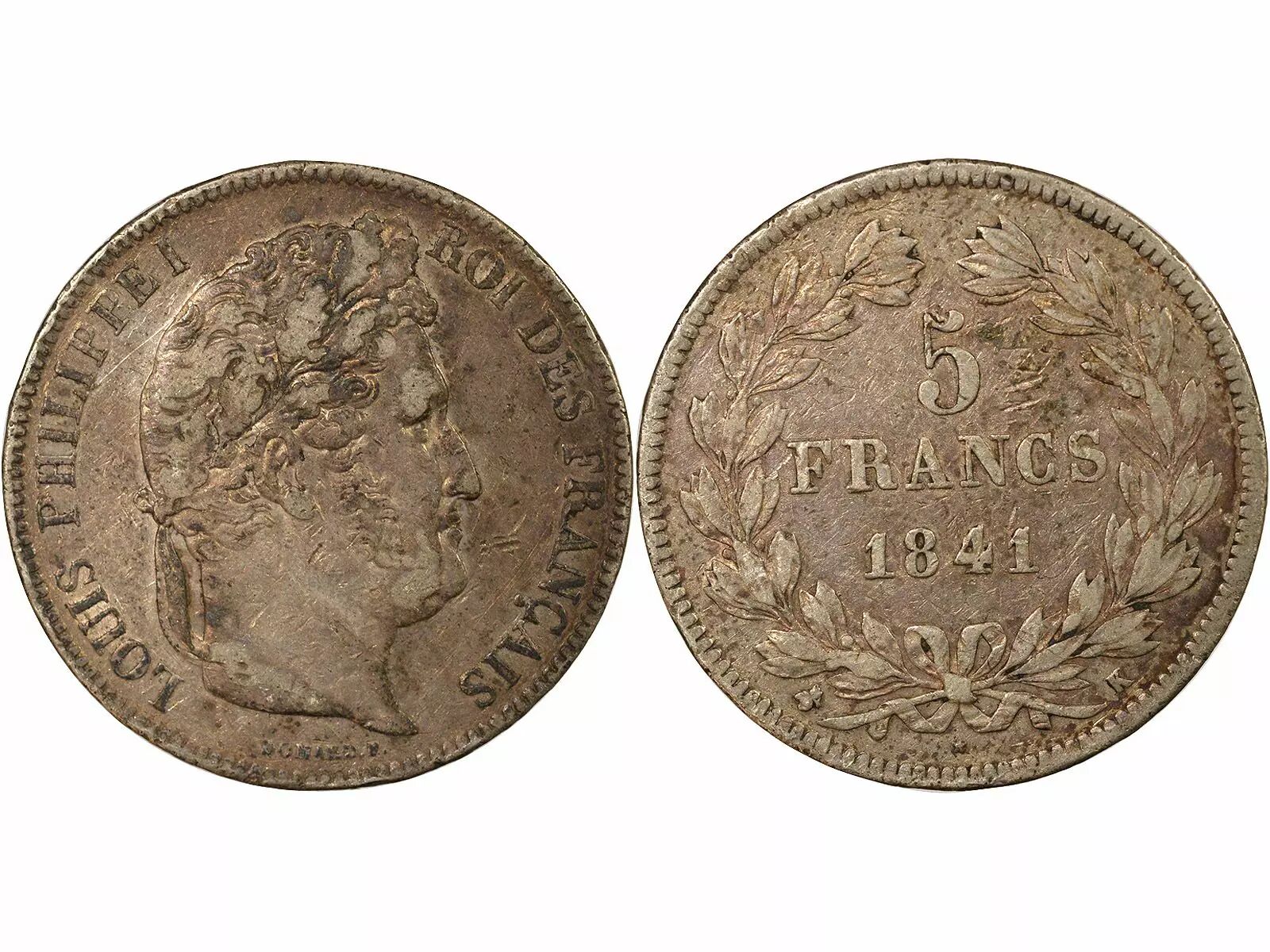 Accueil > Archivage > archivage-Monnaies françaises (470 à 2002) > France Louis Philippe I - 5 Francs Argent, Tr. en relief - 1841 K Bordeaux