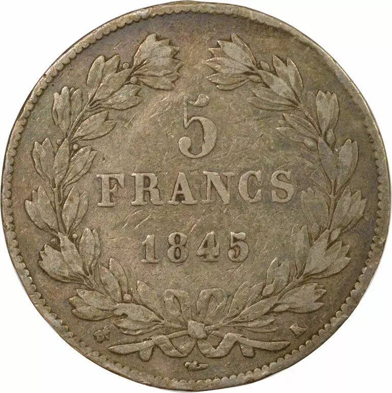 Sur l?avers, on retrouve un portrait de Louis-Philippe Ier, gravé dans un relief élevé, représentant le roi en profil, comme il était d'usage sur les pièces de cette époque. Son visage, minutieusement détaillé, reflète son image de "roi bourgeois", un souverain proche de son peuple. L?inscription qui accompagne son portrait indique : "Louis-Philippe Ier Roi des Français", affirmant son statut de monarque constitutionnel. L'année 1845 apparaît sous le portrait, marquant l'année de frappe.