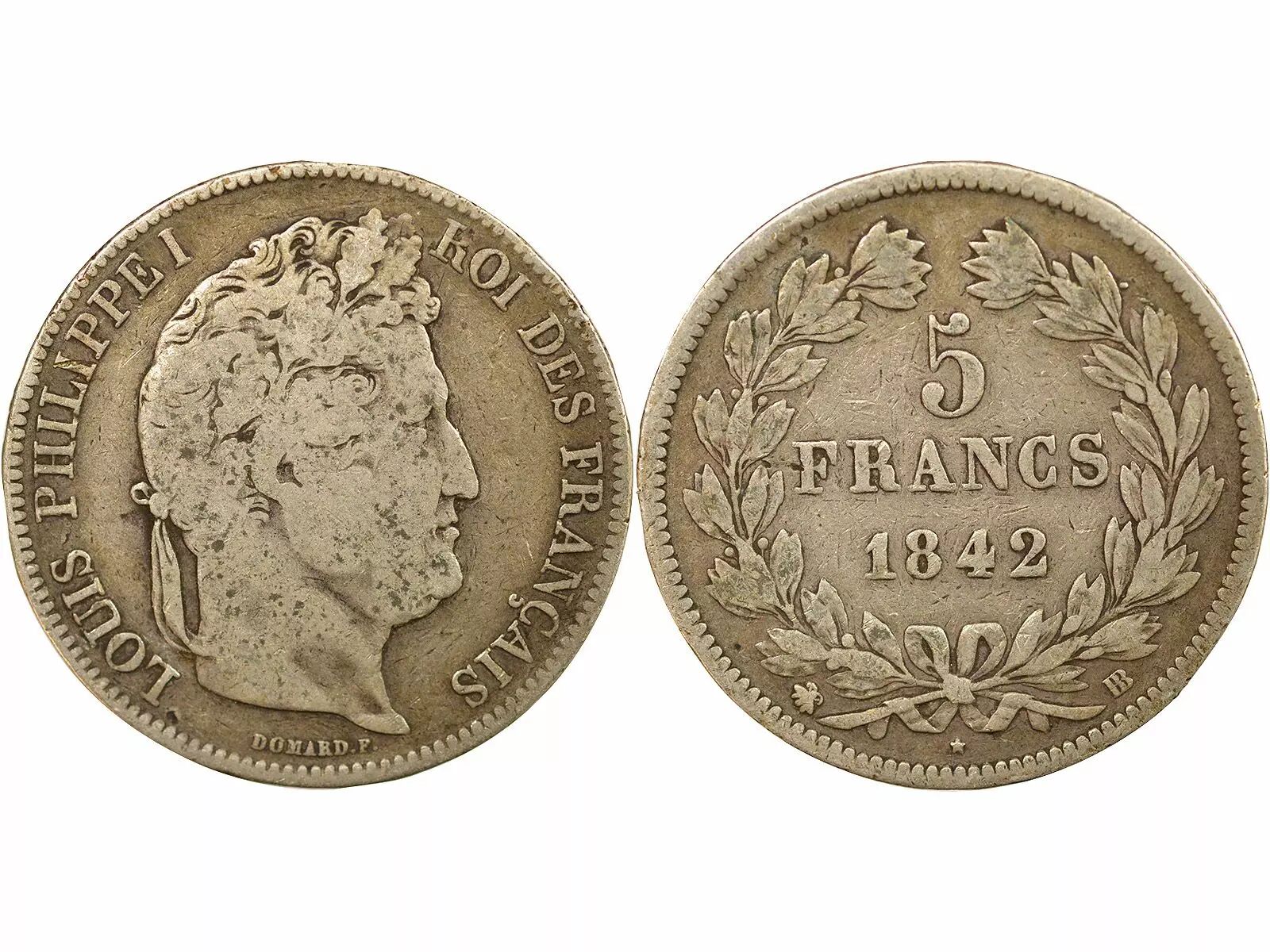 Coin France Louis-Philippe I - 5 Silver Francs, raised edge - 1842 BB Strasbourg