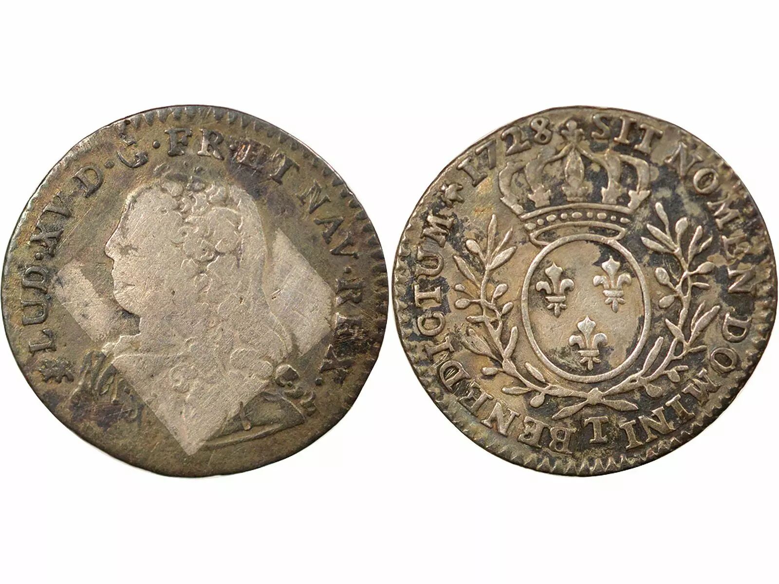 Home > French coins (470 à 2002) > Royal Coinage (987 to 1870) > Louis XV (1710-1774) > France Louis XV - 1/10 Silver Ecu with Olive Branches - 1728 T Nantes