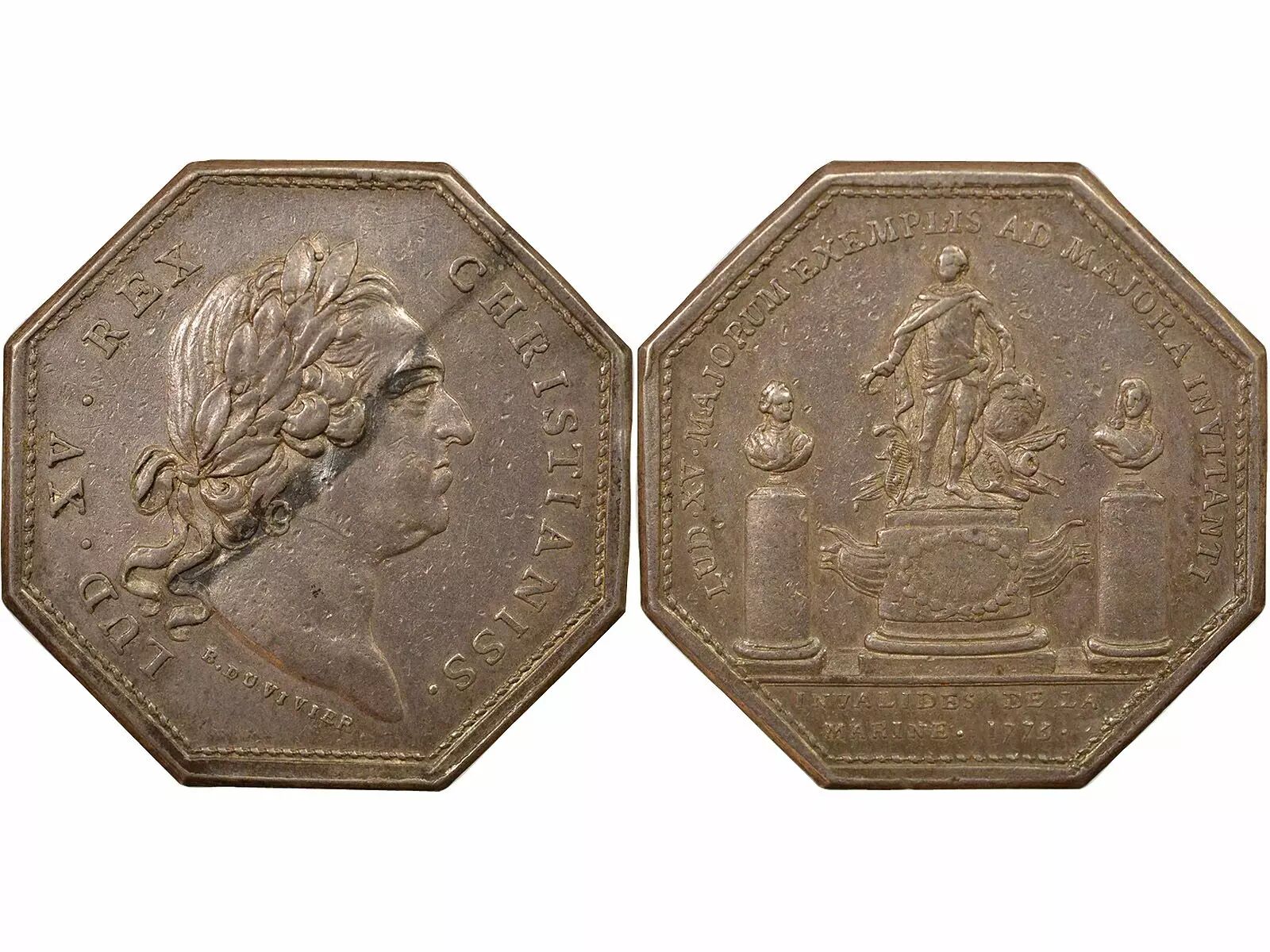 Revers : LUD . XV . MAJORUM EXEMPLIS AD MAJORA INVITANTI / INVALIDES DE LA / MARINE . 1773 .