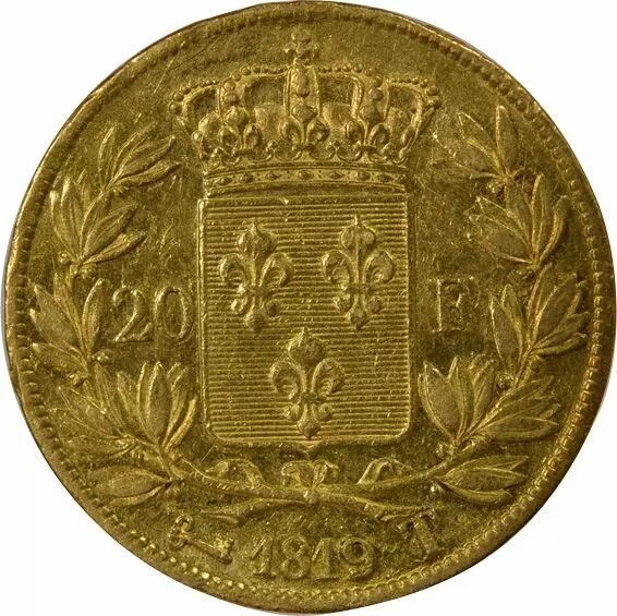 Accueil > > France Louis XVIII - 20 Francs Or, Tête nue - 1819 T Nantes
