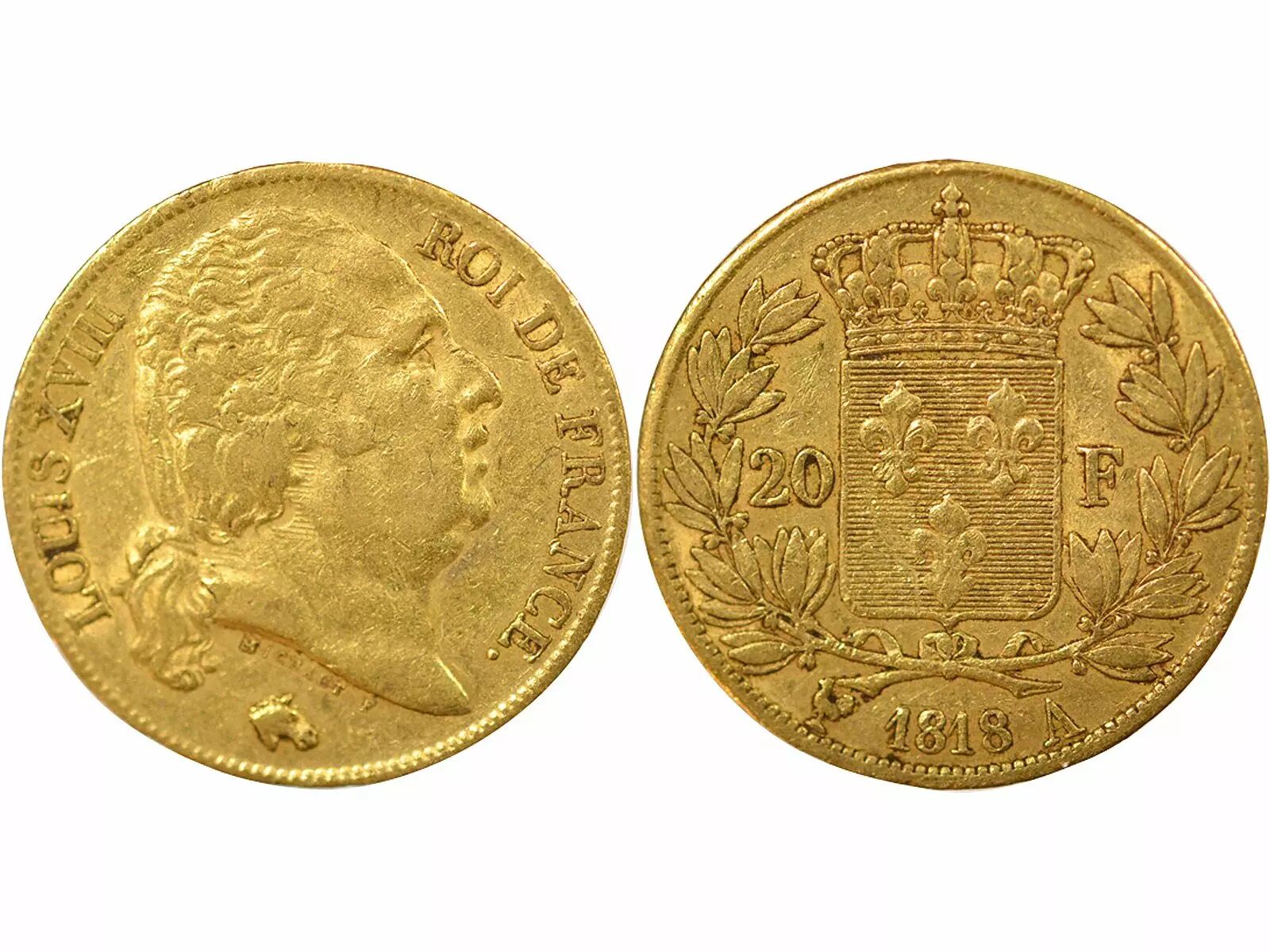 Home > > France Louis XVIII - 20 Gold Francs, Bare Head - 1818 A Paris