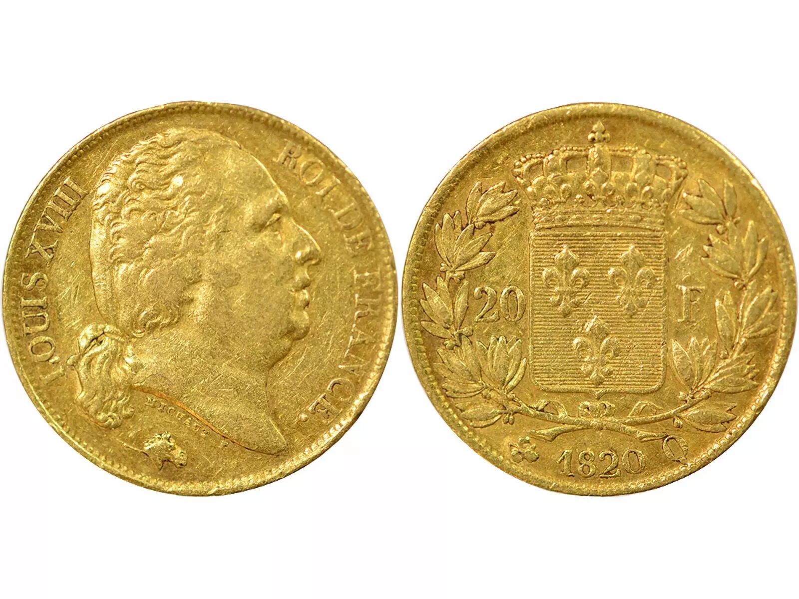 Coin France Louis XVIII - 20 Gold Francs, Bare Head - 1820 Q Perpignan