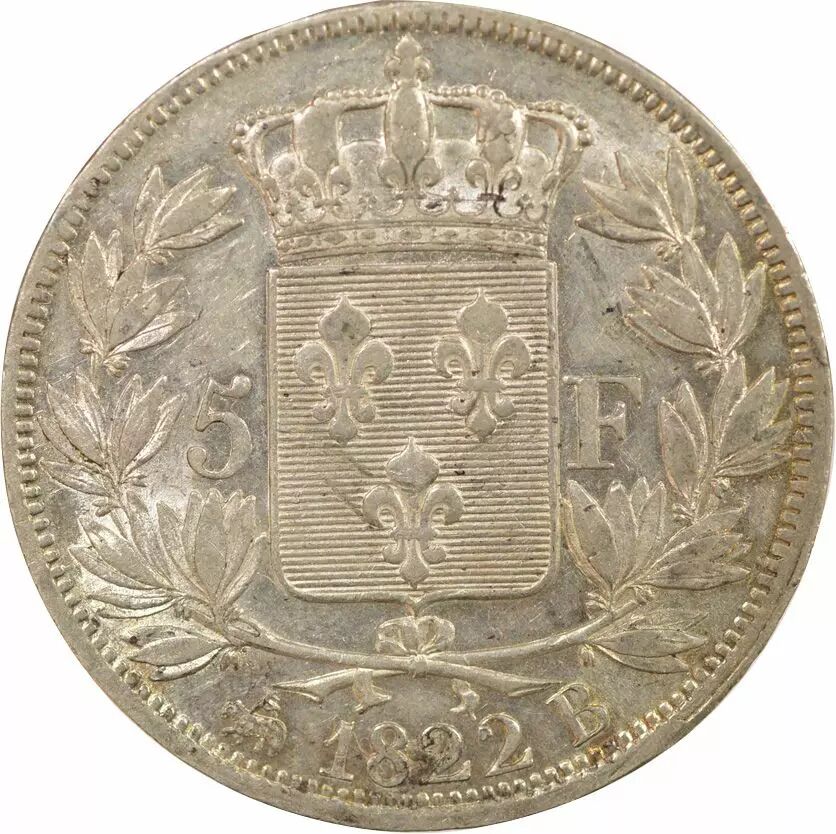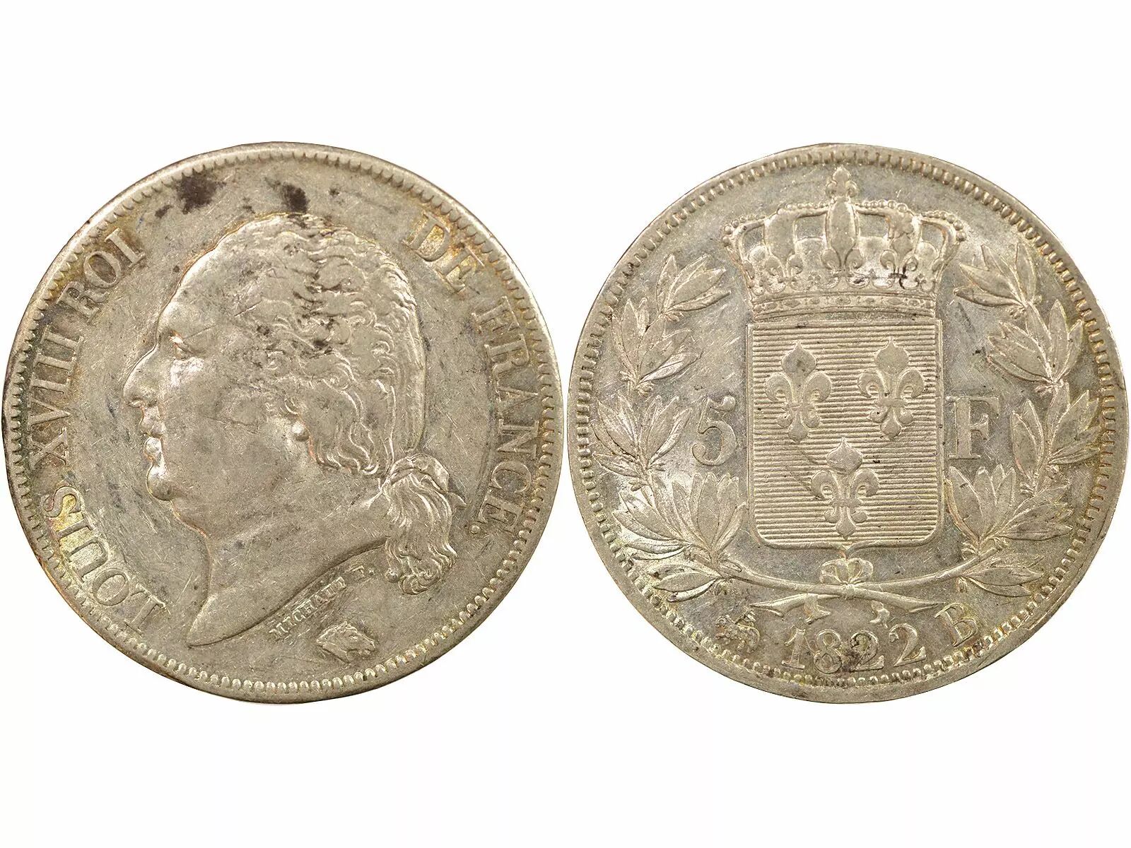 Pièce France Louis XVIII - 5 Francs Argent, tête nue - 1822 B Rouen