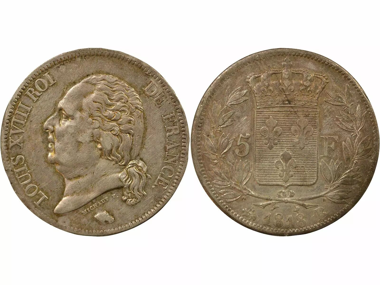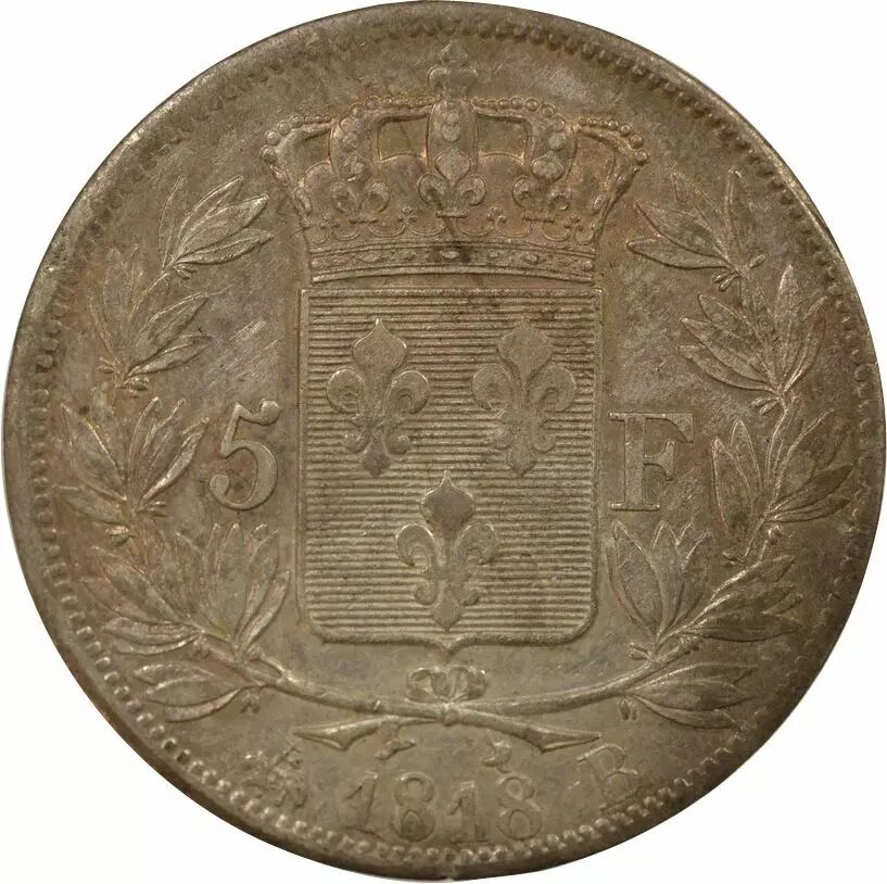 Home > > France Louis XVIII - 5 Silver Francs, Bare Head - 1818 B Rouen