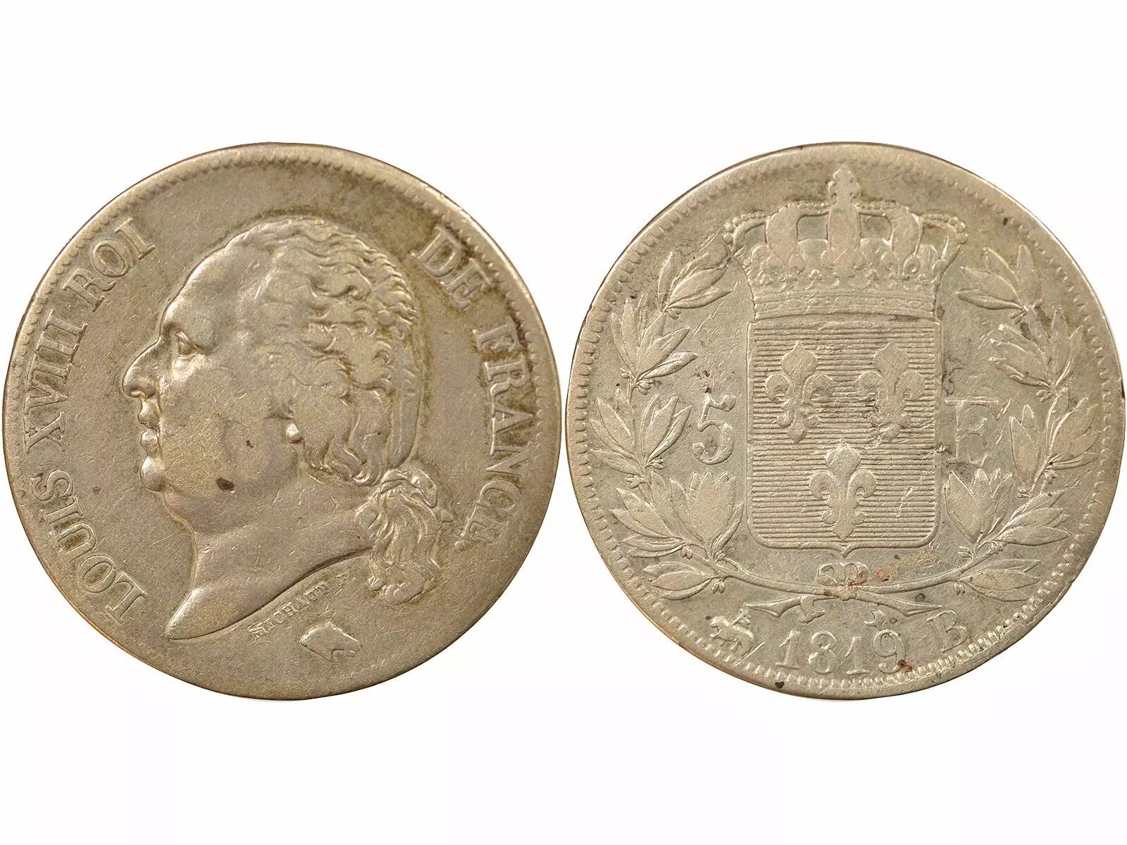 Coin France Louis XVIII - 5 Silver Francs, Bare Head - 1819 B Rouen
