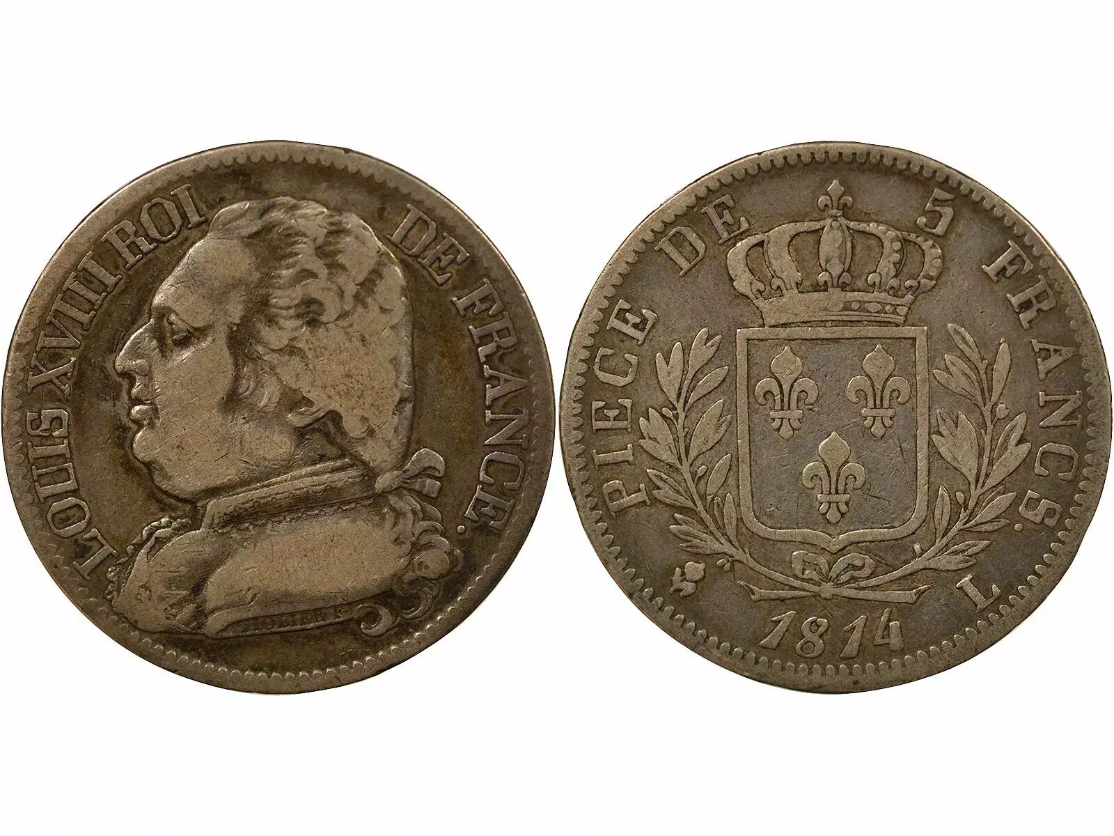 Coin France Louis XVIII - 5 Silver Francs, Dressed up Bust - 1814 L Bayonne