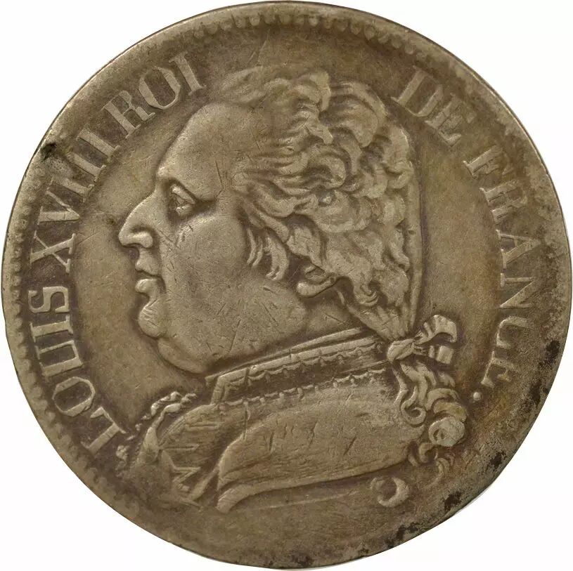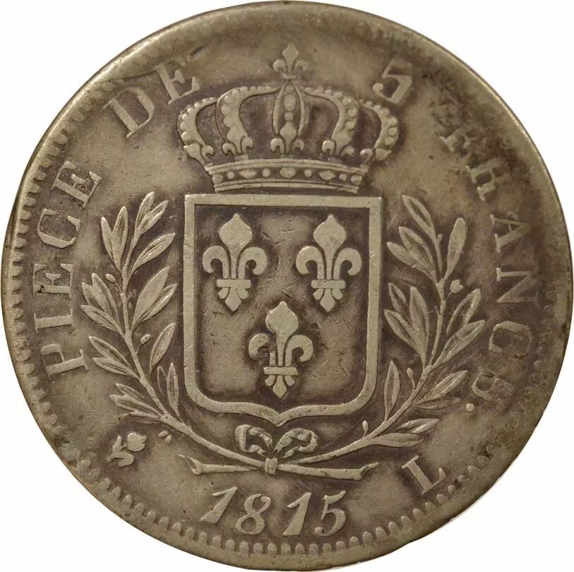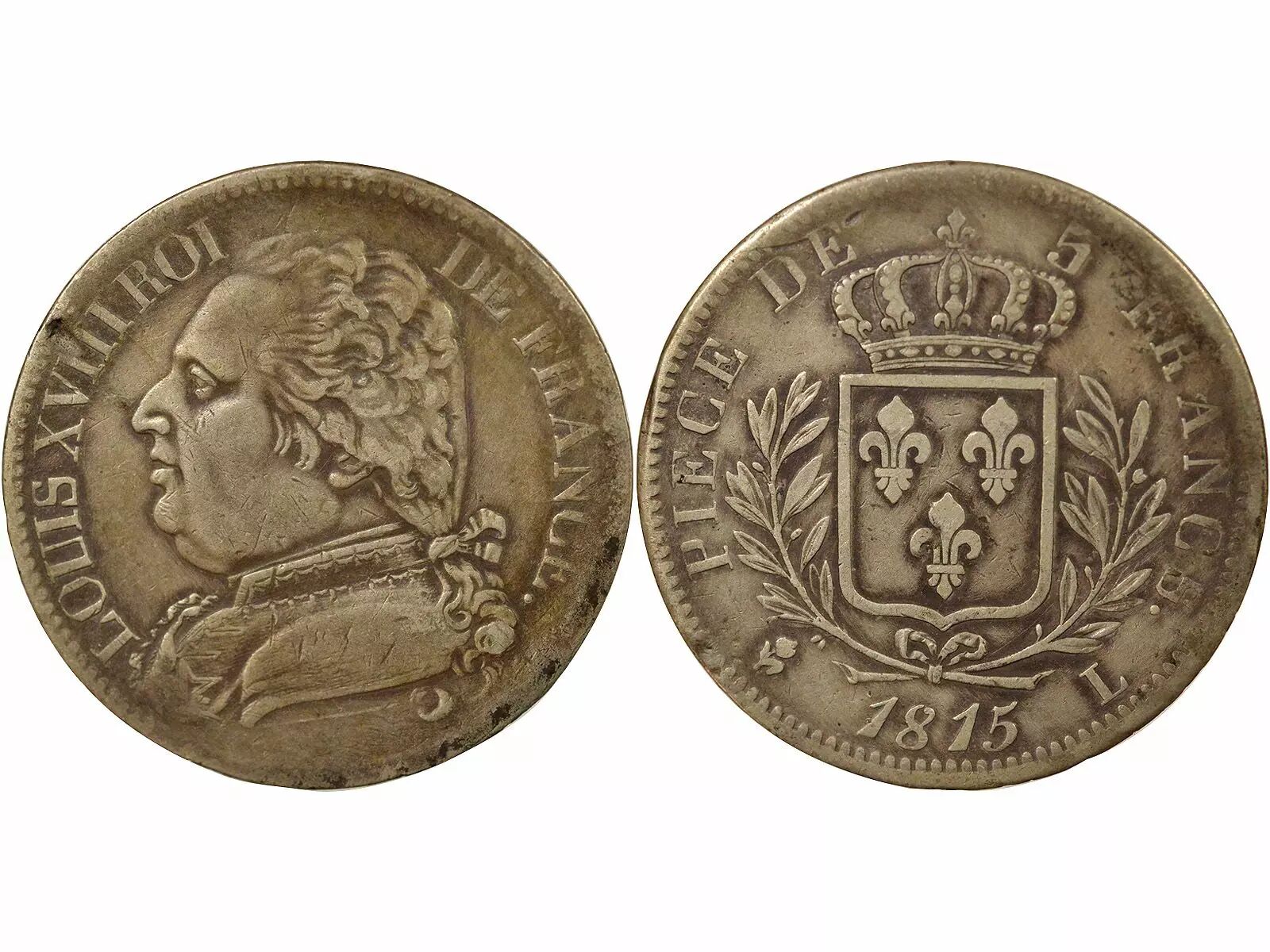 Coin France Louis XVIII - 5 Silver Francs, Dressed up Bust - 1815 L Bayonne