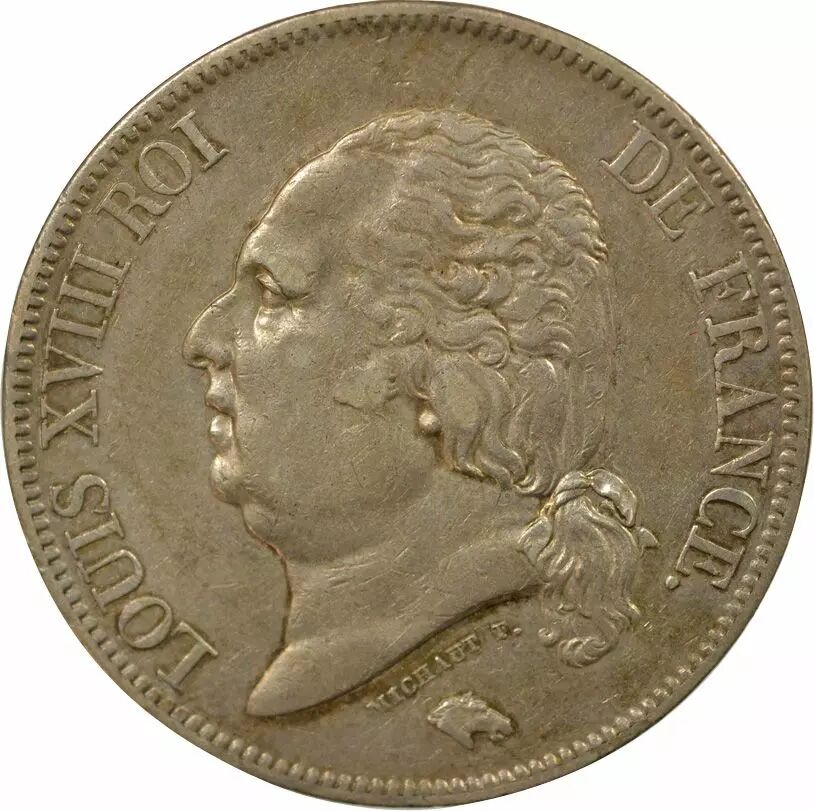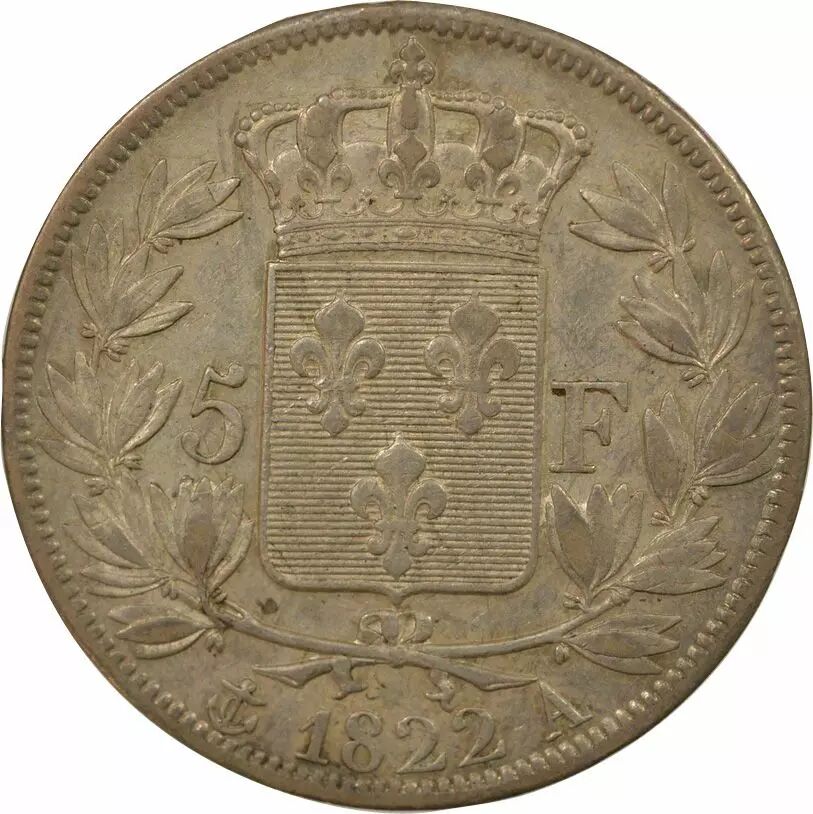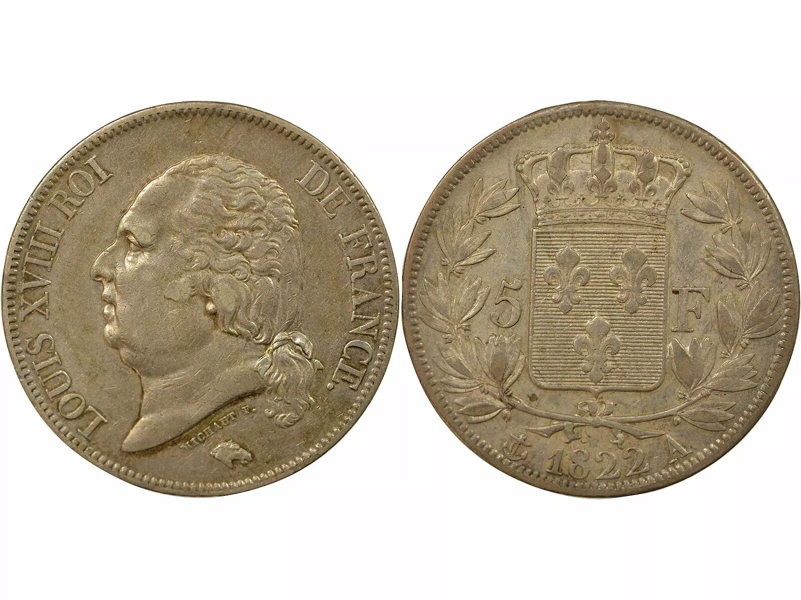Home > French coins (470 à 2002) > Modern Currencies (1789 to 2002) > 5 Francs > France Louis XVIII - 5 Silver Francs, Dressed up Bust - 1822 A Paris