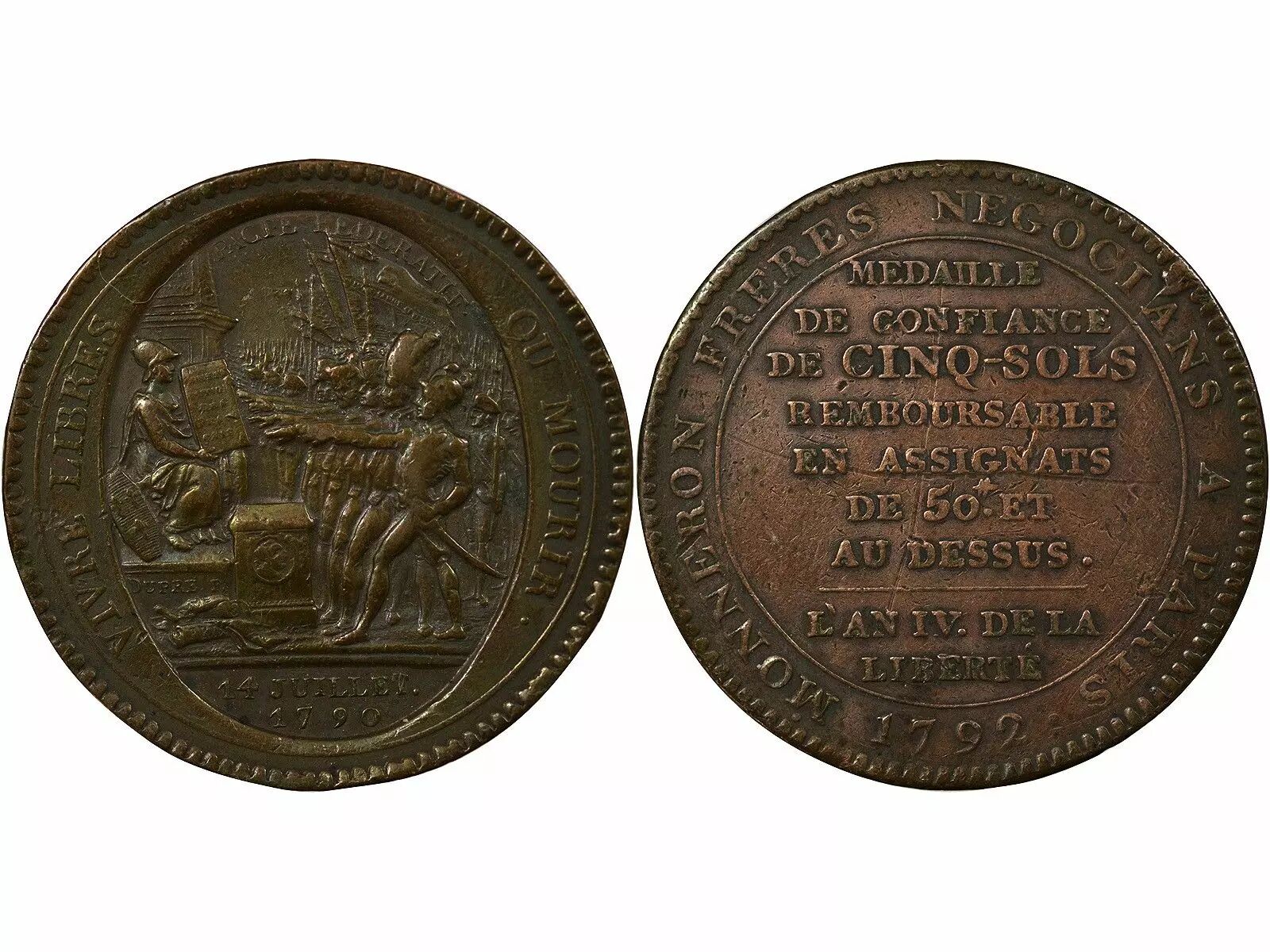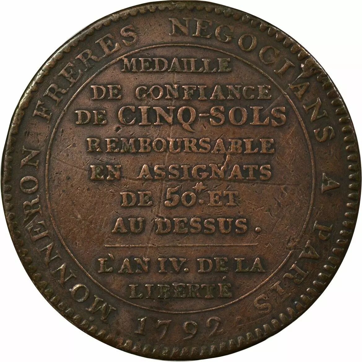 Pièce France Monnaie De Confiance - Monneron 5 Sols Au Serment 1792 L'An Iv "Departemens"