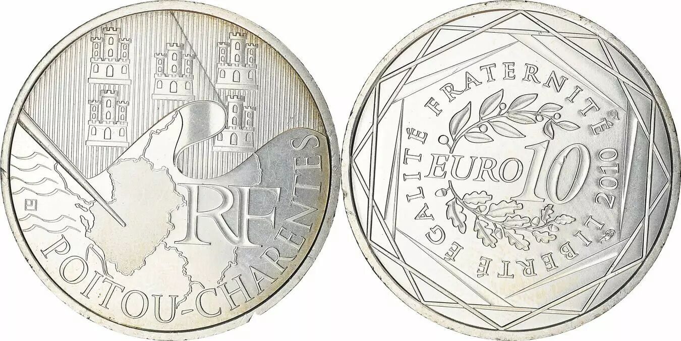 Sur la face un dessin correspondant à chaque région apparaît sur un fond stylisé. En pourtour dans le bas de la pièce figure le nom de chaque région. Une reprise graphique du drapeau régional couronne l?ensemble sur la partie haute de la pièce. Le revers commun dévoile au milieu la valeur faciale de 10 ? entourée de 2 branches l?une de chêne l?autre de laurier évoquant le sigle de l?Euro. L?inscription « Liberté Egalité Fraternité » se place sur le pourtour de la pièce et l?ensemble du motif se voit encadré par un assemblage de traits représentant l?hexagone.