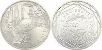 Sur la face un dessin correspondant à chaque région apparaît sur un fond stylisé. En pourtour dans le bas de la pièce figure le nom de chaque région. Une reprise graphique du drapeau régional couronne l’ensemble sur la partie haute de la pièce. Le revers commun dévoile au milieu la valeur faciale de 10 € entourée de 2 branches l’une de chêne l’autre de laurier évoquant le sigle de l’Euro. L’inscription « Liberté Egalité Fraternité » se place sur le pourtour de la pièce et l’ensemble du motif se voit encadré par un assemblage de traits représentant l’hexagone.