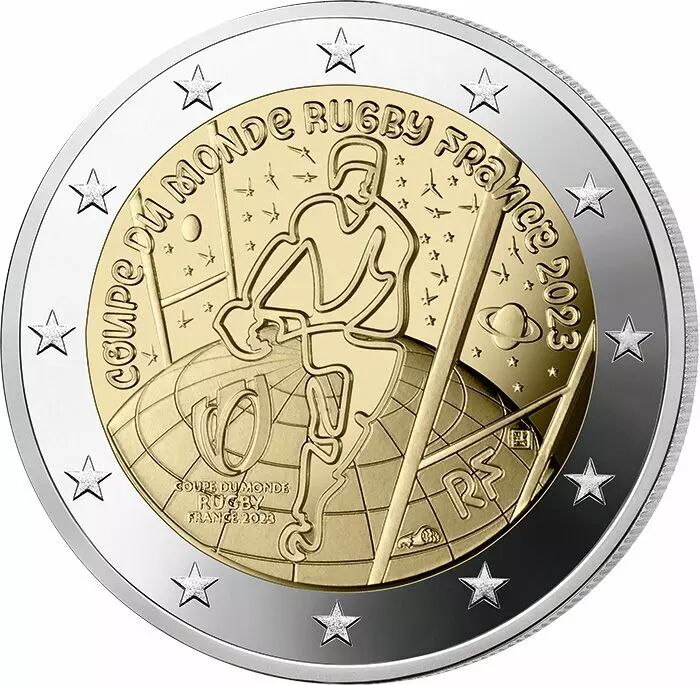 La face de la monnaie représente en son centre un joueur de rugby stylisé avec un ballon à la main. Sous ses pieds, le terrain s?est transformé en globe terrestre marqué par les parallèles et les méridiens. Un ciel étoilé et deux planètes ovales en référence au ballon de rugby entourent la Terre comme une allégorie à