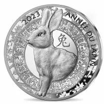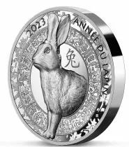 Entouré par un cercle aux motifs traditionnels chinois un lapin apparaît en plein centre de la face. Seule la partie avant de l’animal est dévoilée comme si celui ci sortait d’une porte en avançant dans notre direction. L’idéogramme du lapin apparait sur la droite de sa représentation. Le millésime 2023 ainsi que l’inscription « Année du lapin » apparaissent en haut dans le cercle le plus extérieur.