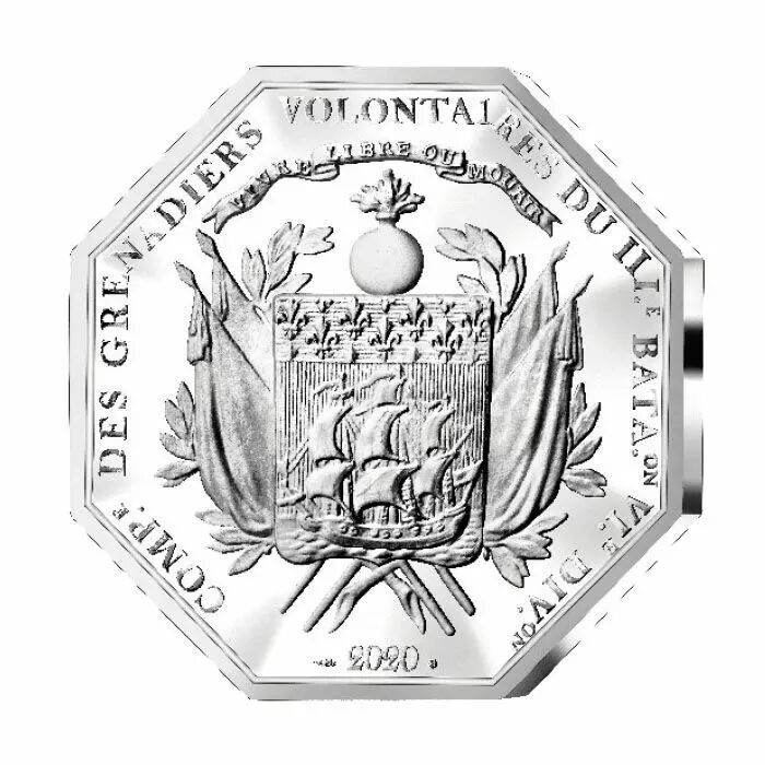 Le revers représente un blason composé du visuel de l?Hermione la frégate utilisée par La Fayette pour se rendre à Boston. Un oriflamme où il est inscrit ?Vivre libre ou mourir? flotte au-dessus du blason et montre la conviction des colons américains à réclamer leur indépendance.