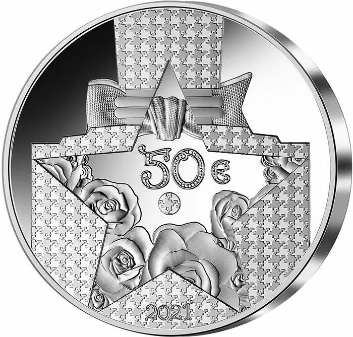 Reprenant le dessin de la monnaie de 1 kg Or cette coupure rend hommage aux codes de la maison Dior : la forme du flacon iconique de Miss Dior le pied de poule les roses de Grasse toutes différentes ainsi que le n?ud couture. La mention RF est présente au centre du dessin avec la typographie issue des archives de la maison.