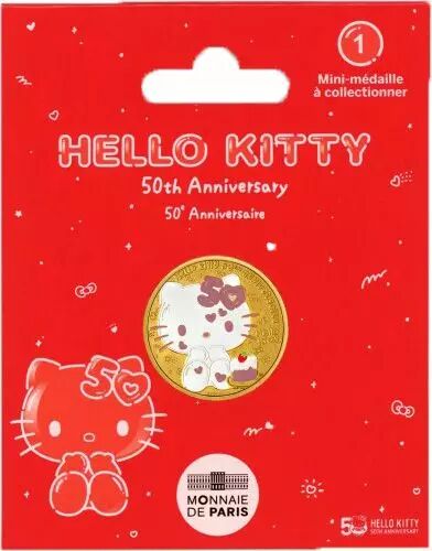 Sur la face de la mini-médaille figure une Hello Kitty avec un nœud spécialement créé pour son 50ème anniversaire. Elle semble surprise à la vue de son gâteau surmonté d’une fraise au premier plan.