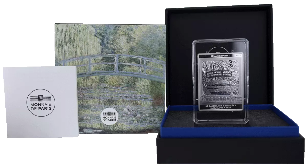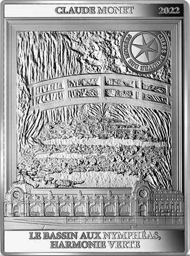 La très grande richesse de l?art pictural en France depuis plusieurs siècles fut l?occasion pour la Monnaie de Paris de débuter une nouvelle série qui rend hommage aux plus grands des chefs d??uvre présents dans nos musées. Les courants et les influences ? Renaissance Baroque Impressionnisme? ? sont célébrés. Chaque année plusieurs ?uvre sont mises à l?honneur. En 2022 la collection s'enrichit avec "Bassin aux Nymphéas - Harmonie verte" de Monet et cette coupure de 100 grammes d'argent.