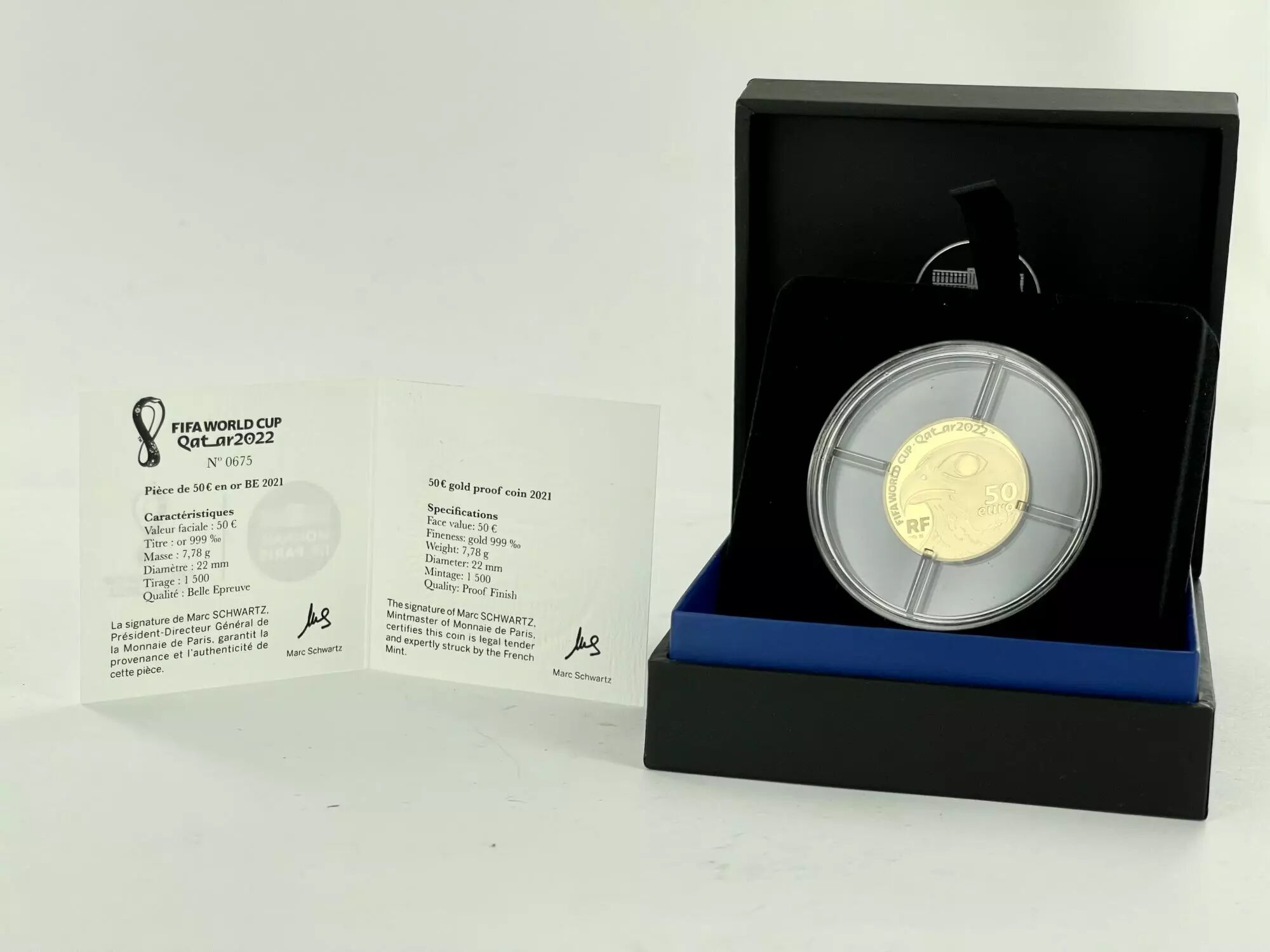 A l'occasion de la prochaine Coupe du Monde au Qatar en 2022, la Monnaie de Paris propose une première série de 3 pièces : une en argent et deux en or. On retrouve le faucon, oiseau associé au pays du Golfe Persique, dont l'oeil est remplacé par un ballon. Sur le revers, le logo de la compétition apparait ainsi que le millésime. Des éléments graphiques d'inspiration orientale ornent ce coté ainsi qu'une création graphique avec les mots "Play Together" semblent former des arabesques de l'écriture arabe tout en reprenant des éléments d'un terrain de foot