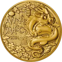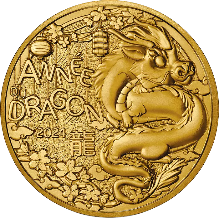 Entouré de fleur de prunier, symbole très utilisé dans l?histoire et dans l?art chinois, ainsi que de lanternes, le dragon est représenté de façon enfantine. L?inscription « Année du dragon» suivi du millésime 2024 apparaissent au centre de la monnaie. L?idéogramme du dragon apparait en dessous.