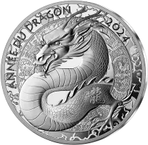 Entouré par un cercle aux motifs traditionnels chinois, un dragon apparaît en plein centre de la face. La tête ainsi que l’avant du corps de l’animal sortent du cercle. La représentation du dragon est inspirée de celle de l’iconographie chinoise classique et met en avant le côté puissant et charismatique de cette créature légendaire. L’idéogramme du dragon apparait sur le corps de celui ci. Le millésime 2024 ainsi que l’inscription « Année du Dragon» apparaissent en haut, dans le cercle le plus extérieur