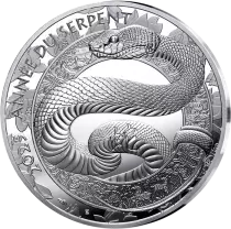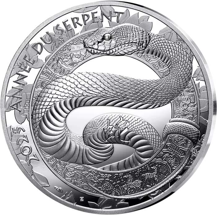 En plein centre de la face de la monnaie, un serpent ondule autour d?un anneau gravé de motifs traditionnels chinois. Le reptile est en mouvement, partiellement enroulé autour de l?anneau et comme prêt à s?échapper des bordures de la monnaie ornées d?orchidées, fleur associée à ce signe. L?impression de calme qui se dégage de la représentation du serpent renvoi directement à ce qui est une des principales caractéristiques des natifs de ce signe. L?idéogramme « Serpent » apparait sur une des courbes du corps de celui-ci. Le millésime 2025 ainsi que l?inscription « Année du Serpent » apparaissent sur les contours du dessin.