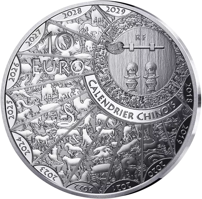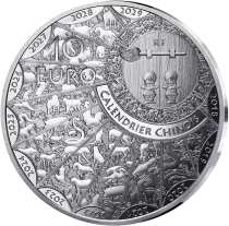 Au revers, on retrouve l?ensemble des animaux du zodiaque chinois répartis sur un paravent entourant une porte traditionnelle de temple. Un cycle complet du zodiaque chinois commence en 2018 et dure jusqu?à 2029. Chacune de ces douze années met donc en avant un animal issu de ce calendrier. La valeur faciale est visible en haut à gauche et la mention « RF » se situe sur la porte.