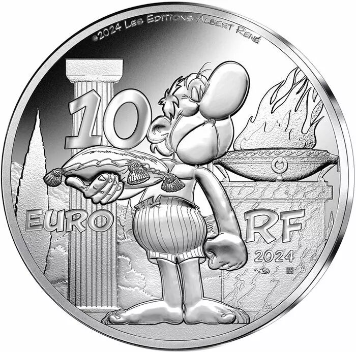 Cette monnaie de collection en argent colorisé met en valeur le sport au travers d?une posture humoristique où Obélix et le romain Claudius Cornedurus choisissent de s?adonner à l?art du pugilat. Le petit Idéfix, qui semble impressionné par cette situation, a décidé de se cacher derrière Obélix. Le champ de la monnaie est également orné d?éléments relatifs au sport et à l?olympisme. Le revers adapte en volume la couverture de la bande dessinée « Astérix aux jeux Olympiques », où Astérix porte fièrement la valeur faciale de la monnaie.
