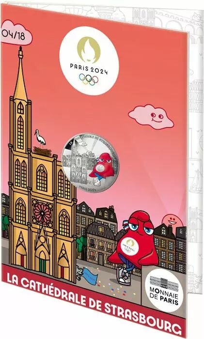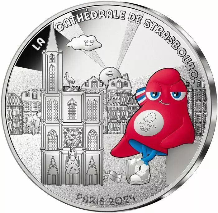 Sur cette monnaie, accoudée sur un muret, la mascotte sourit d’un air malicieux. Près d’elle se dresse la cathédrale de Strasbourg sur laquelle une cigogne a fait son nid. Dans le fond, des bâtiments à colombages typiques de l’Alsace rappellent l’architecture de la ville.