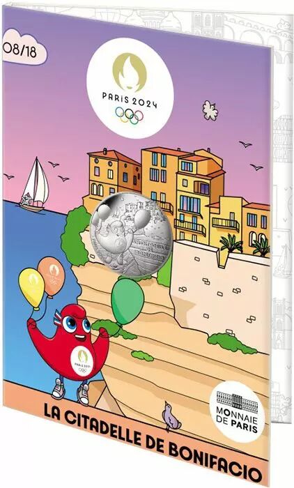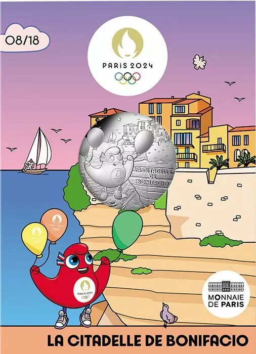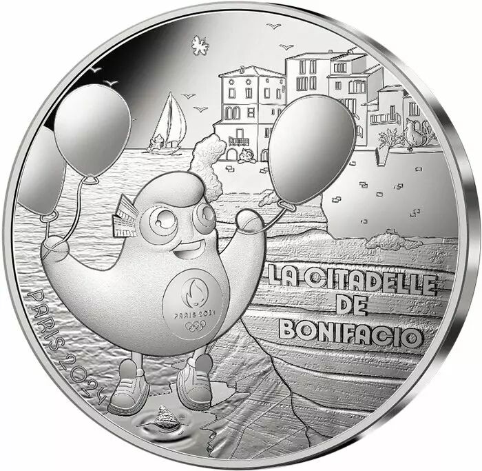 Sur cette monnaie, la mascotte des Jeux Olympiques s’envole au-dessus de la mer, portée par des ballons de baudruche. Elle admire la citadelle de Bonifacio perchée sur une haute falaise derrière elle. Plus loin sur la mer, entouré de mouettes, un voilier se détache sur le ciel.