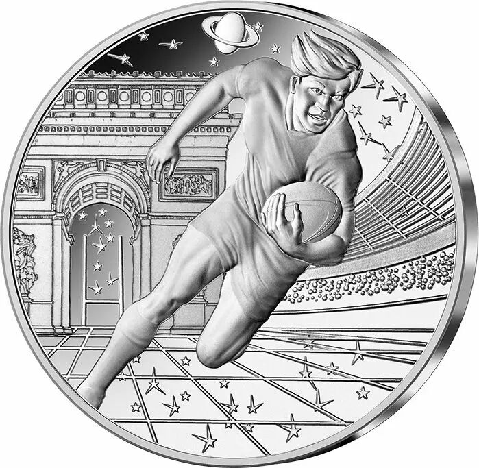 La face de la monnaie représente un joueur de rugby en pleine action qui court avec un ballon. Derrière lui se dresse un monument français emblématique et symbole de victoire : l?Arc de Triomphe. Sous l?arche on peut distinguer des poteaux, comme si l?Arc était au milieu d?un stade. Dans le ciel, une planète ovale fait référence à la « planète rugby ».