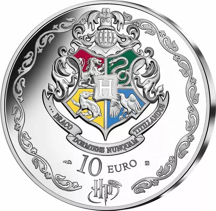 Le revers de cette monnaie arbore le blason en couleur de l’école de sorcellerie Poudlard. Les emblèmes des maisons sont ici représentés au dessus de la devise de l’école «Draco Dormiens Nunquam Titillandus » signifiant «Ne chatouillez pas un dragon qui dort». On retrouve sous le blason la valeur faciale de cette monnaie
