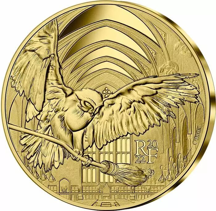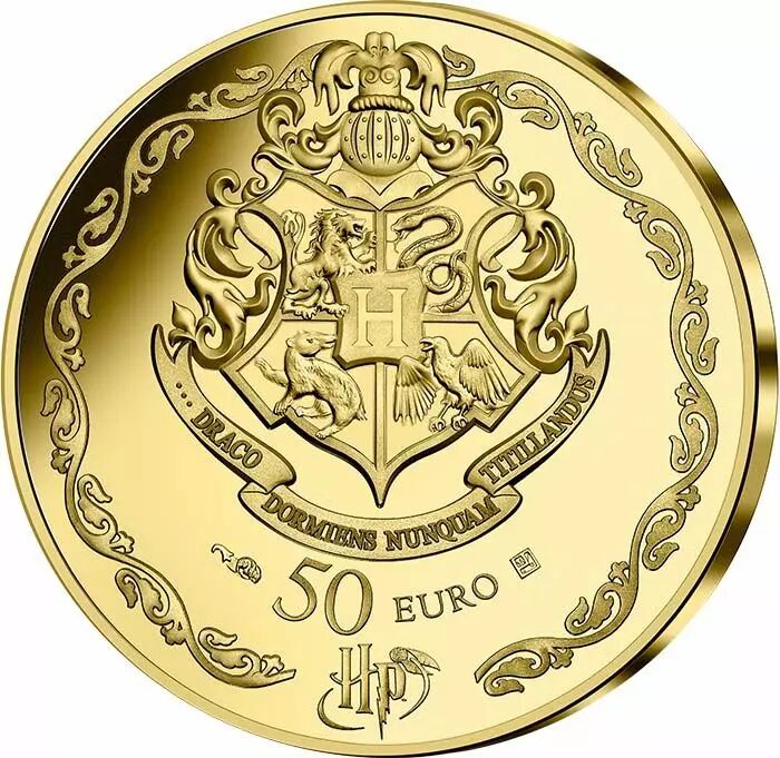 Cette monnaie de 50 en or représente Hedwige la chouette de Harry Potter. Celle ci tient dans ses serres le Nimbus 2000 cadeau du professeur McGonagall pour le nouvel attrapeur de l’équipe de Gryffondor. On retrouve en arrière plan la salle de banquet de Poudlard ainsi que le millésime de la monnaie.