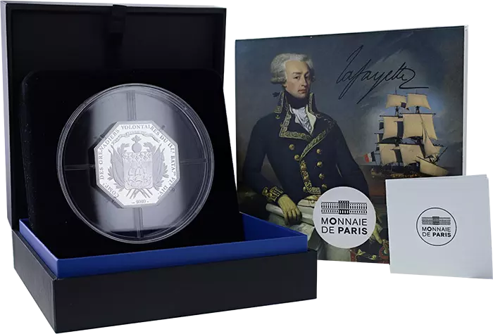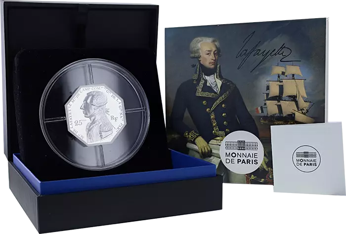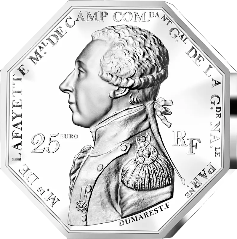 La face représente le portrait du Marquis de La Fayette de profil. La gravure est tirée d’une ancienne médaille ce qui apporte de l’authenticité à la pièce. Le nom Marquis de La Fayette ainsi que ses grades sont inscrits sur le pourtour de la pièce. La 25 et la 200 euros ont une forme octogonale ce qui relève d’une prouesse technique et une innovation de découpe.