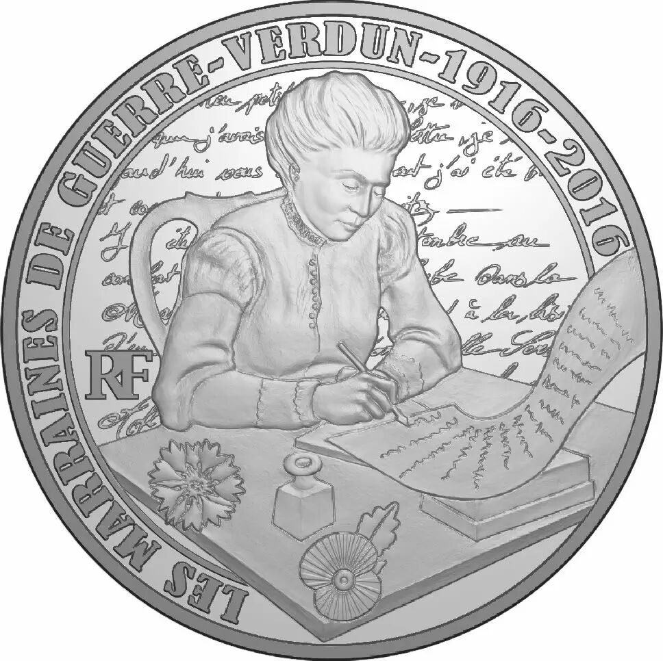 Viennent s’ajouter le Coquelicot et le Bleuet, symboles respectifs des anciens combattants du Commonwealth et de la France. La lettre de la marraine se prolonge vers le bord de la pièce et atteint le revers où elle arrive jusqu’aux soldats dans les tranchées de Verdun. L’un des soldats lit la lettre tandis que ses camarades sont à leur poste. Sur le bas du revers, les camions