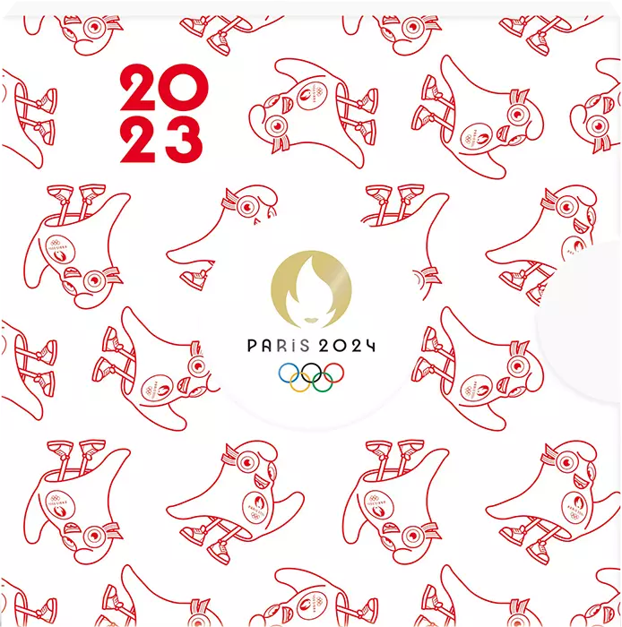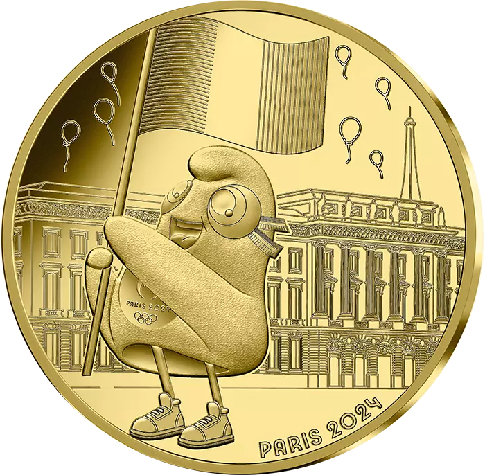 Devant le bâtiment historique de la Monnaie de Paris la Mascotte des Jeux Olympiques de Paris 2024 brandit le drapeau avec l?emblème des Jeux pour affirmer sa joie de pouvoir assister à une telle compétition en plein c?ur de la capitale française