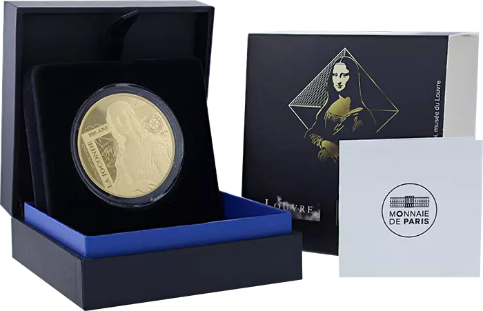 Le revers est donc de forme rectangulaire. Il intègre le revers commun à la série qui présente un mélange des vues de plusieurs grands musées français. A cela est ajouté le portrait de Leonard de Vinci associé au compas, symbole de la précision. Il est accompagné de deux de ses inventions / créations : la machine volante et l’Homme de Vitruve. Réalisé vers 1490, l’Homme de Vitruve reprend les proportions du corps humain selon l’architecte ingénieur romain Vitruve. Un paragraphe tiré de ses travaux manuscrits en écriture inversée (à des fins de protection) est également visible sur la partie droite de la pièce. L’écriture « 500 ans » évoque l’anniversaire de la mort de Leonard de Vinci. La valeur faciale apparaît sur le visuel commun à la série.