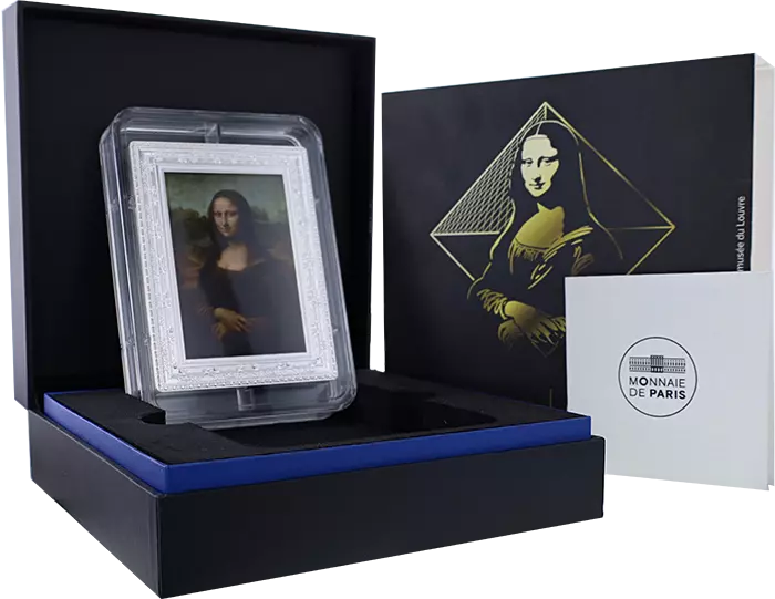 La face reprend la célèbre œuvre de Léonard de Vinci. Le portrait mi-corps de Monna Lisa est réinterprété en son intégralité avec le fond d’origine. Portant une robe vert sombre en soie avec des manches jaunes, La Joconde semble suivre le spectateur de son regard, même lorsqu’il se déplace car ce regard est perpendiculaire au plan de l’image. Ce portrait est entouré d’un cadre argent reproduit à partir du véritable cadre de l’œuvre. Cette coupure sera d’ailleurs de forme rectangulaire, comme la peinture.