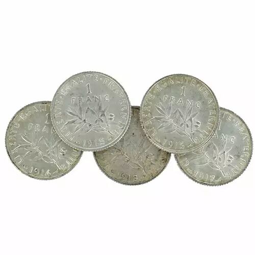 Lot de 5 pièces de 1 Franc Argent France 1914 à 1918.