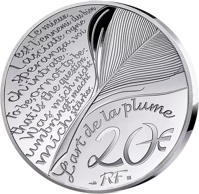 Le revers est commun à toute la série « L?Art de la Plume ». On peut y voir inscrit plusieurs citations emblématiques telles que « Le mieux est l?ennemi du bien » de Voltaire, « Lasciate ogne speranza voi ch?intrate » de Dante Alighieri, « To be or not to be, that is the question » de William Shakespeare ou encore « Was mich nicht umbringt macht mich stärker » de Nietzsche. Une plume est gravée au centre de la pièce. En dessous, est présent le titre de la série. La mention « RF » est présente en bas de la pièce ainsi que le poinçon de Joaquin Jimenez et de l?atelier de gravure.