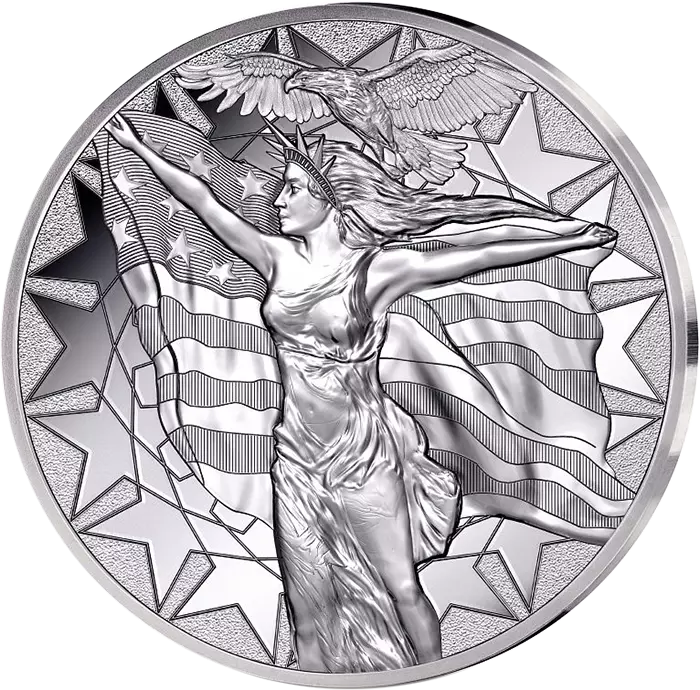 La face de cette monnaie représente Lady Liberty dessinée par Joaquin Jimenez. Il s?agit d?un savant mélange entre réinterprétation et conservation de codes. En effet, à l?image de la gravure originale, cette Lady Liberty regarde vers la gauche, tient le drapeau américain et est vêtue d?une robe ample. Joaquin y apporte sa touche en lui prêtant une expression déterminée et fière, un aigle volant à ses côtés. Elle tient son drapeau par le bout des bras, comme libre; effet accentué par la couronne de la Statue de la Liberté qu?elle porte sur sa tête. Une multitude d?étoiles s?entrecroisent en arrière-plan. Elles se mêlent les unes aux autres, illustrant l?union des états américain.