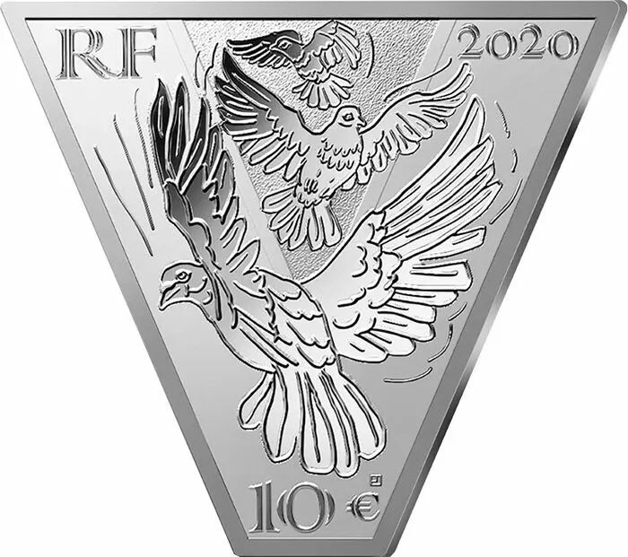 ans Victoire Victory » apparait à droite et fait référence à l’anniversaire de la victoire des Alliés face à l’Allemagne nazie. La monnaie est en forme de trapèze dans lequel vient s’inscrire le V symbolisant la