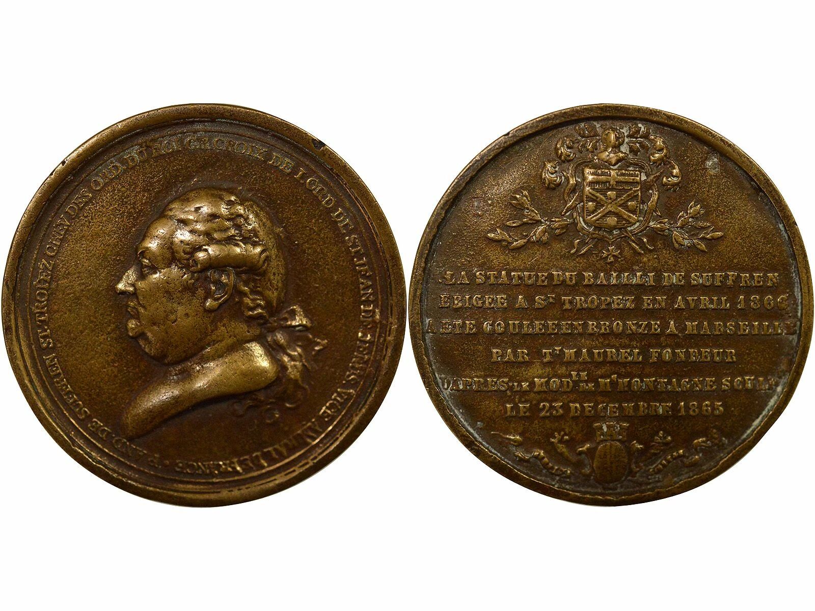 Revers : . LA STATUE DU BAILLI DE SUFFREN / ERIGEE A ST TROPEZ EN AVRIL 1866 / A ETE COULEE EN BRONZE A MARSEILLE / PAR TT MAUREL FONDEUR / D APRES . LE MODLE. DE MS. MONTAGNE SCULPT. / LE 23 DECEMBRE 1865