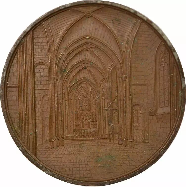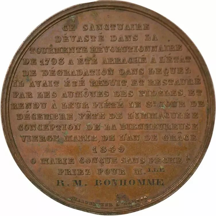 Reverse : CE SANCTUAIRE / DEVASTE DANS LA / TOURMENTE REVOLUTIONNAIRE / DE 1793 A ETE ARRACHE A l'ETAT / DE DEGRADATION DANS LEQUEL / IL AVAIT ETE REDUIT ET RESTAURE / PAR LES AUMONES DES FIDELES ET / RENDU A LEUR PIETE LE 8E. JOUR DE / DECEMBRE, FETE DE L'IMMACULEE / CONCEPTION DE LA BIENHEUREUSE / VIERGE MARIE, DE L'AN DE GRACE / 1849 / O MARIE CONCUE SANS PECHE . / PRIEZ POUR MLLE. / R. M. BONHOMME / CHARPENTIER A NANTES